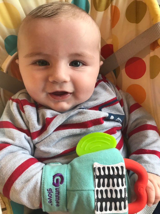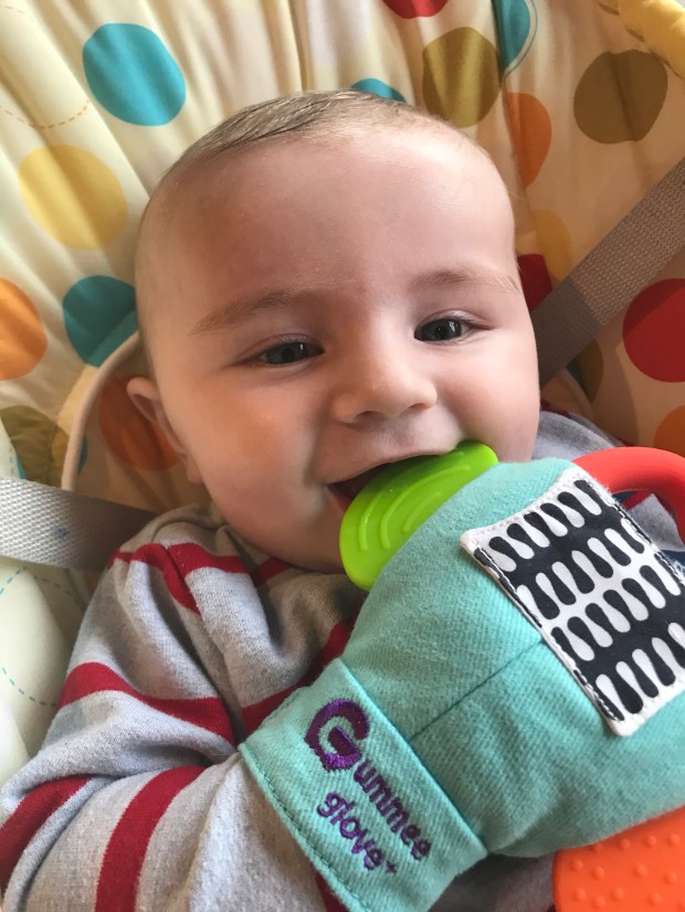 I like to put some teething gel on whatever part of the glove Ben is putting to his mouth; my favorite gel being Teetha. Once baby gets a bit older I move to the Teetha granules.
